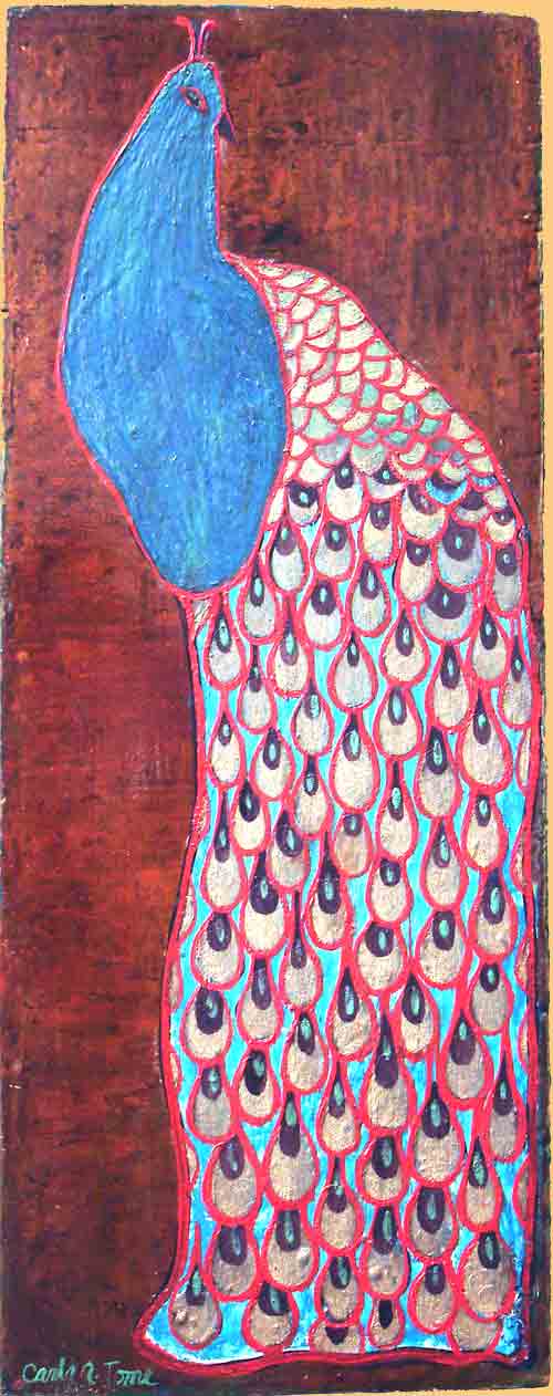 Teardrop Peacock, 4"X10", Mixed Media on Wood
